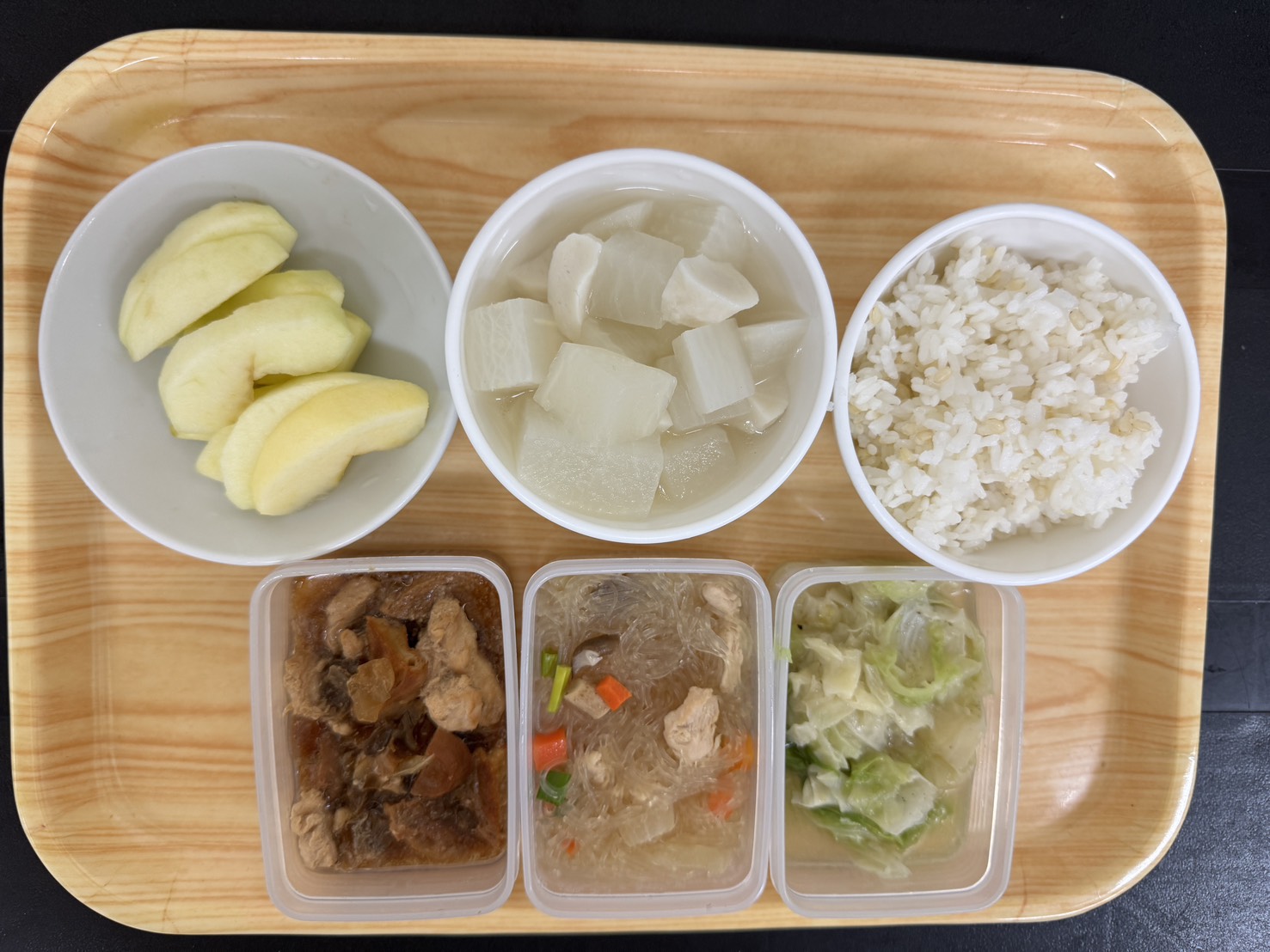 肉末毛豆/什錦百頁/時蔬青菜/胚芽米飯/香菇雞湯/時令水果