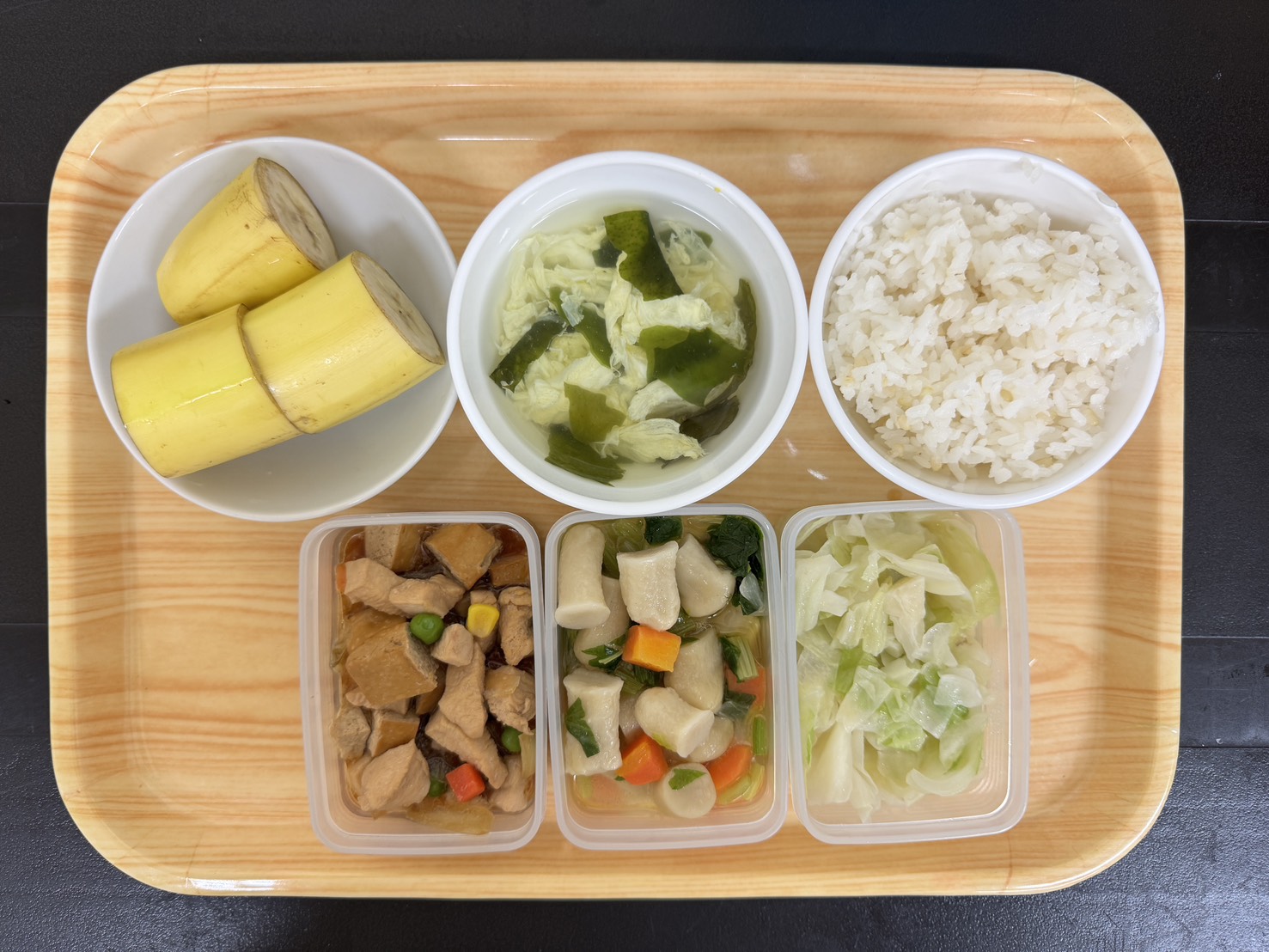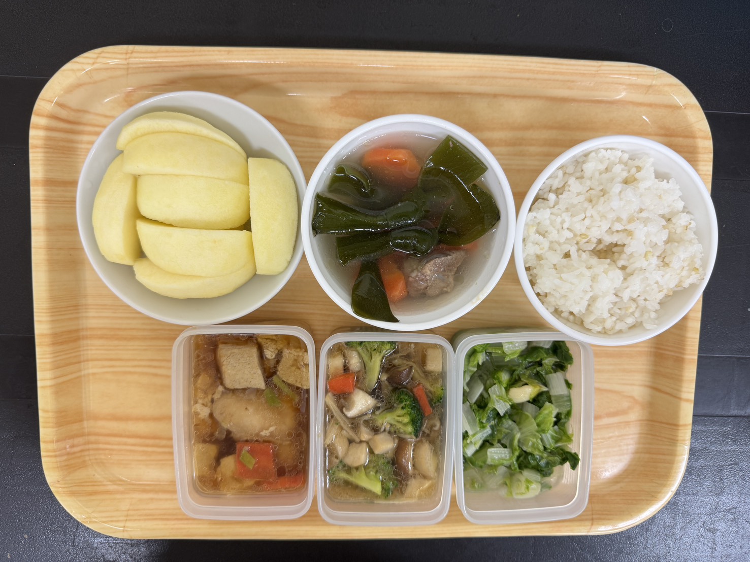 麵輪滷肉/螞蟻上樹/時蔬青菜/胚芽米飯/味噌豆腐湯/時令水果