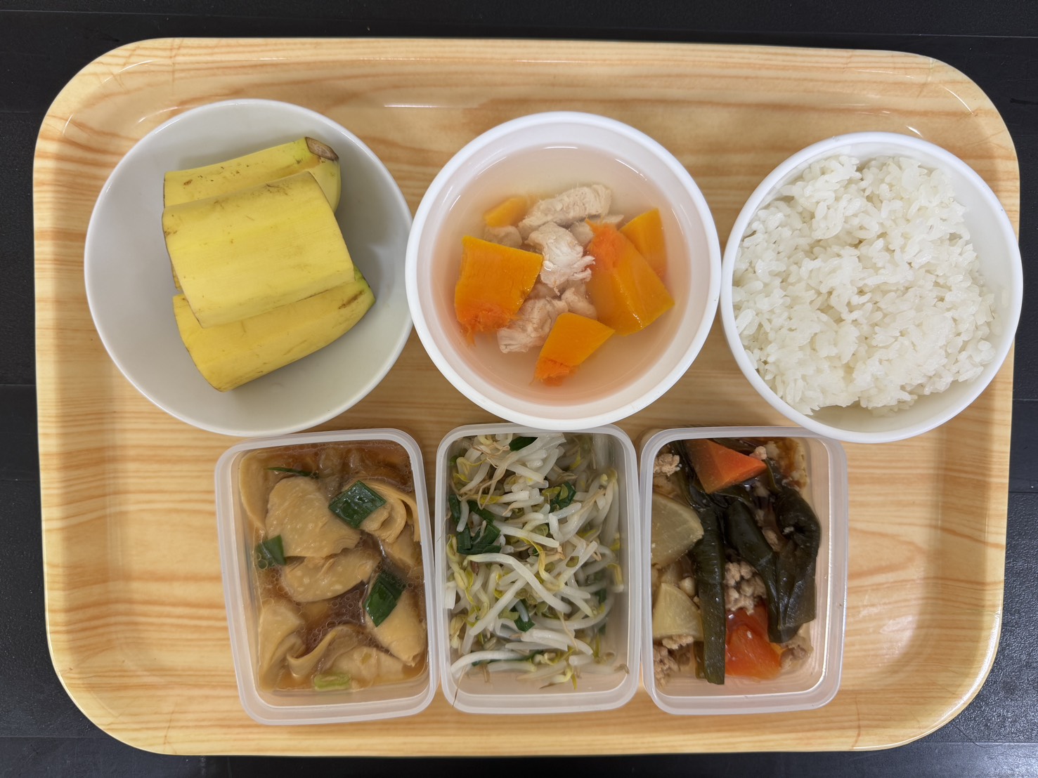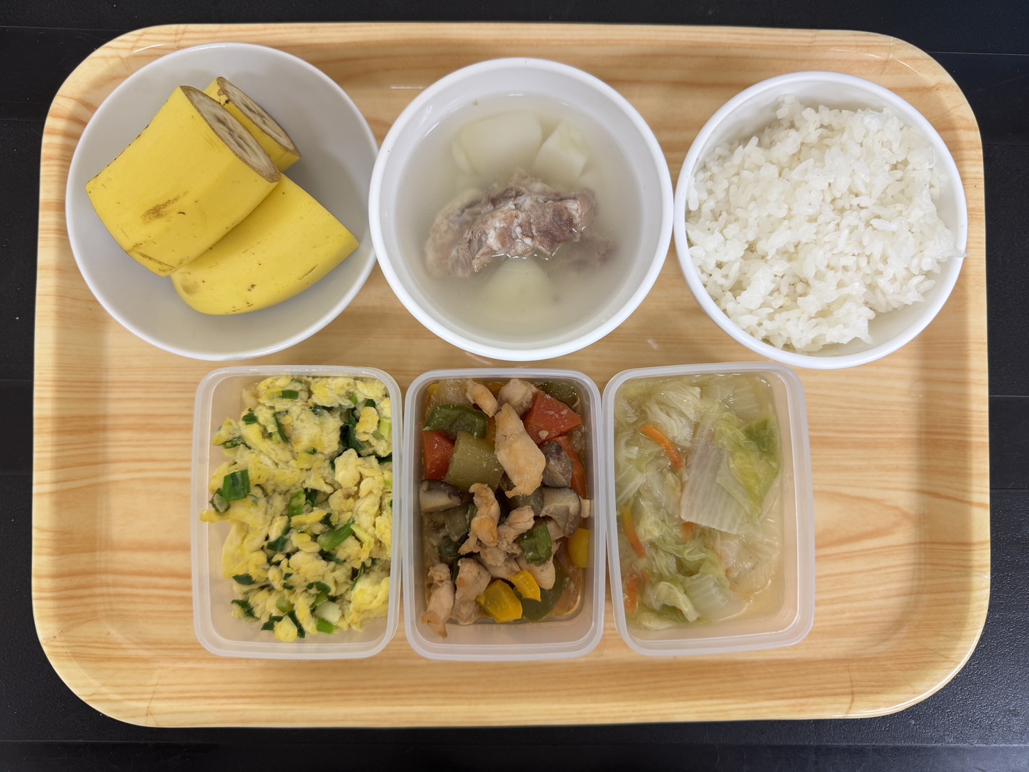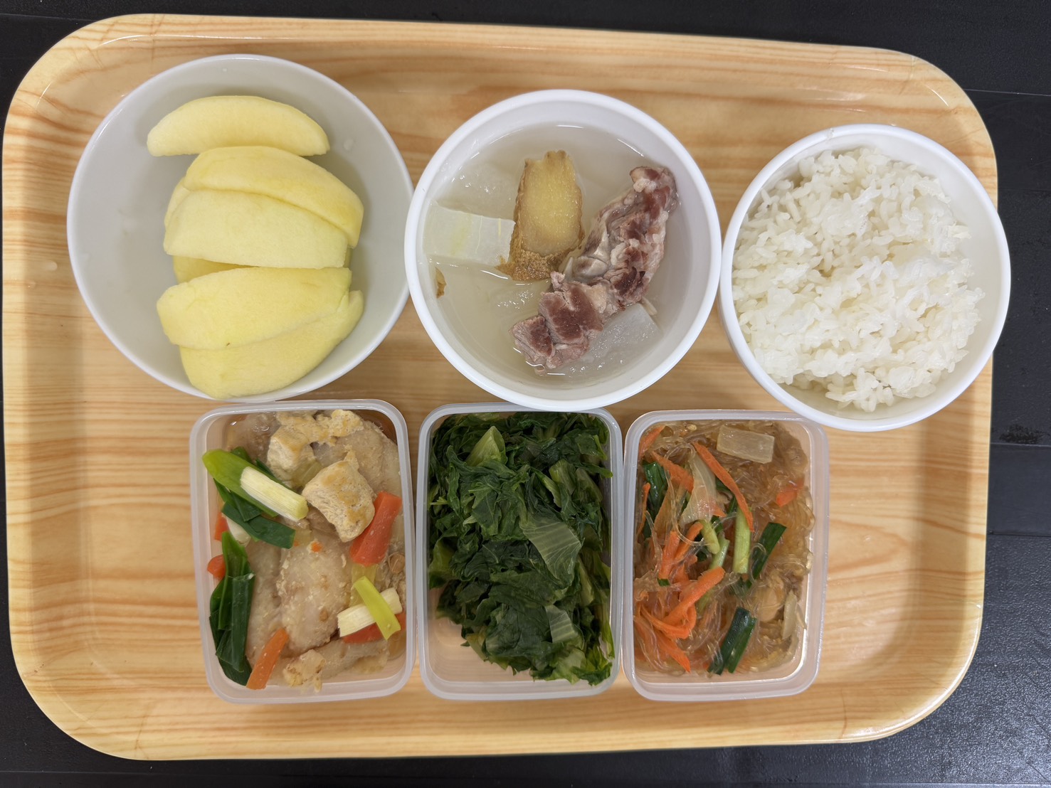 洋蔥肉絲/香菇炒豆干/時蔬青菜/胚芽米飯/海帶芽蛋花湯/時令水果