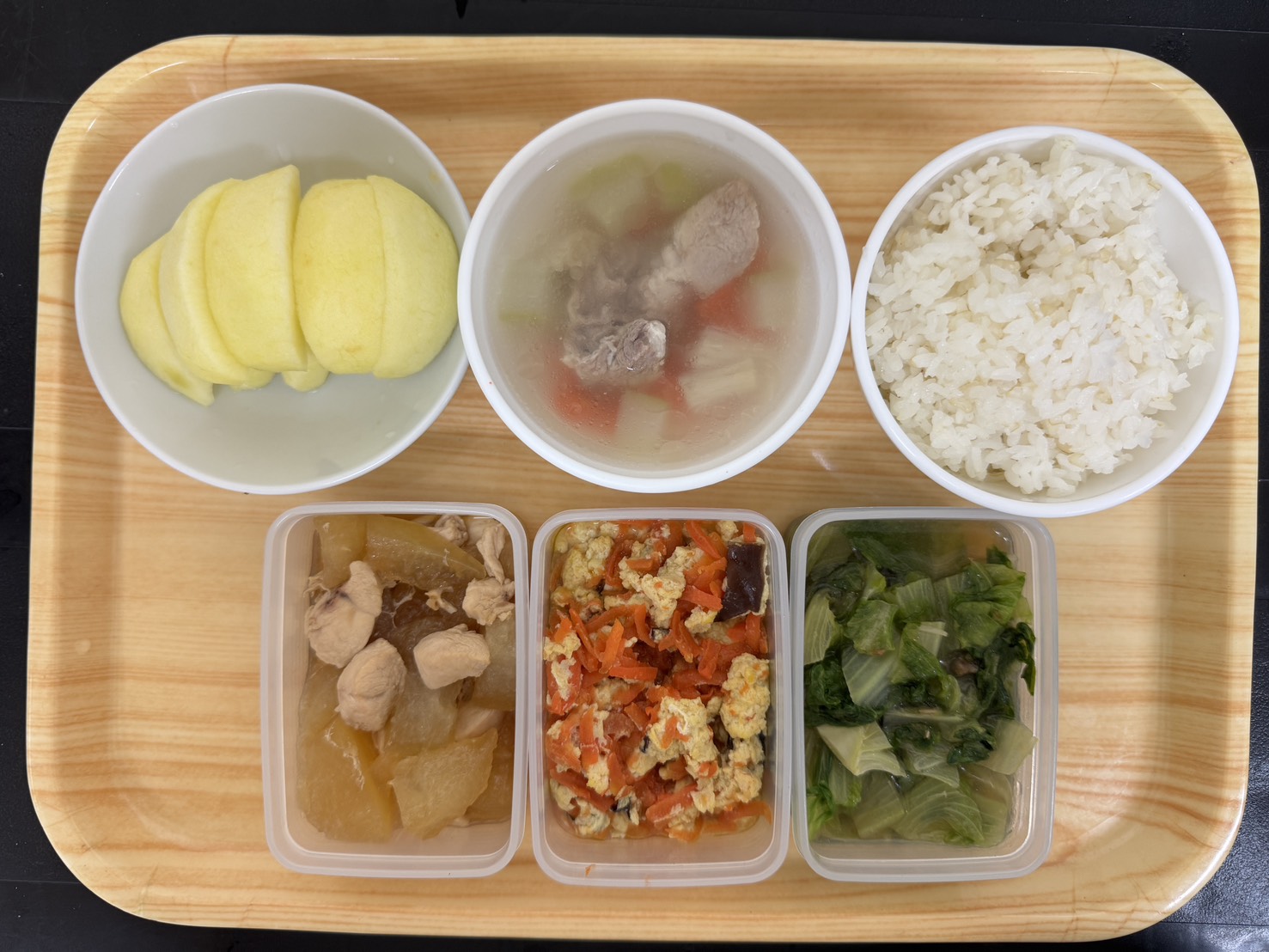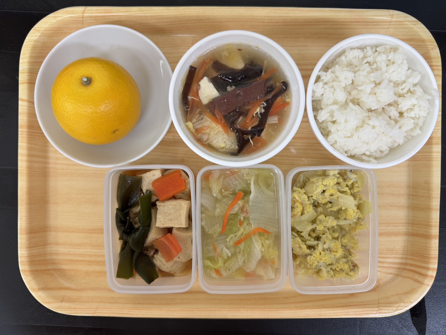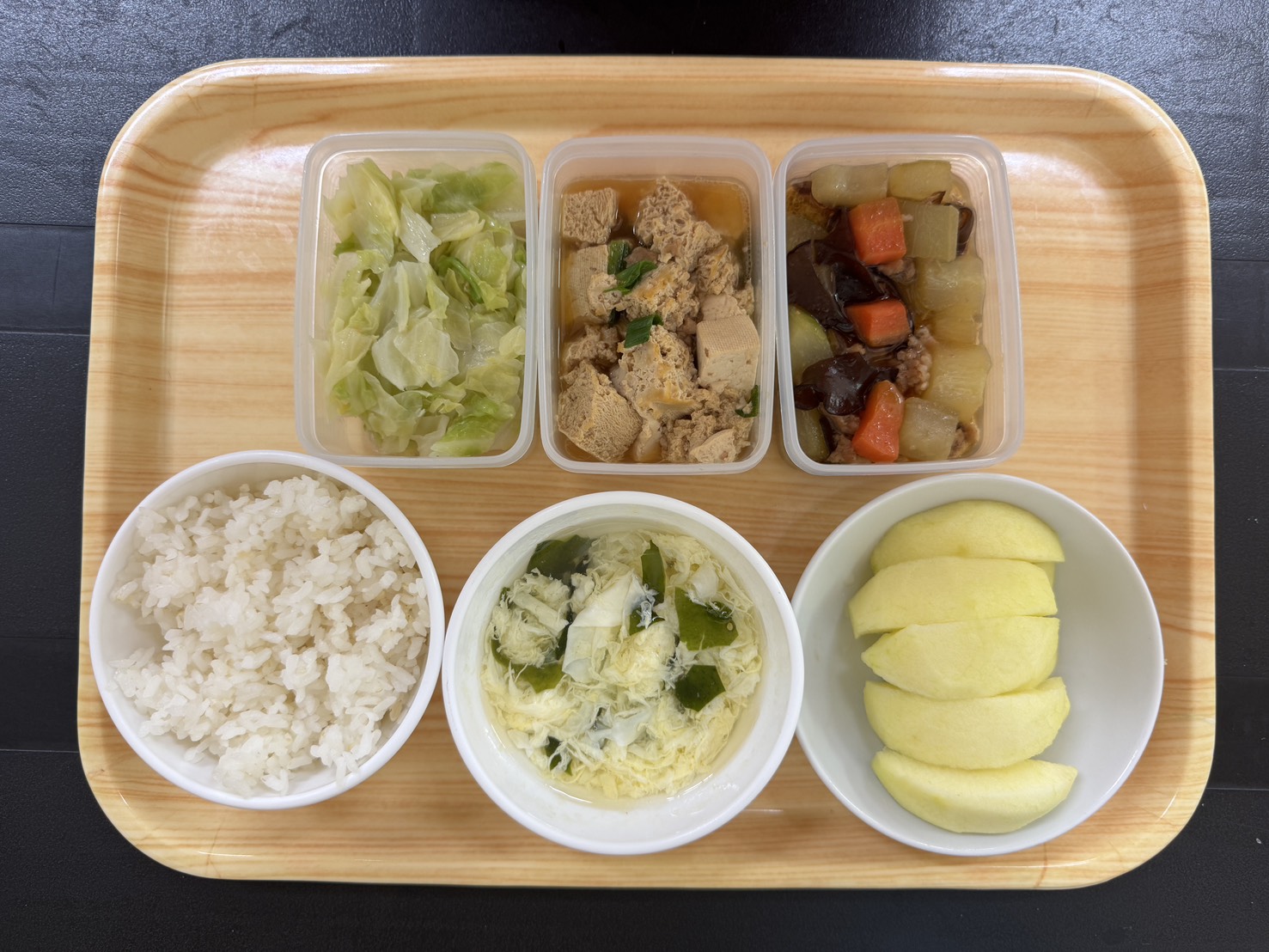 紅燒豆腐/香菇肉絲/時蔬青菜/胚芽米飯/蔬菜蛋花湯/時令水果